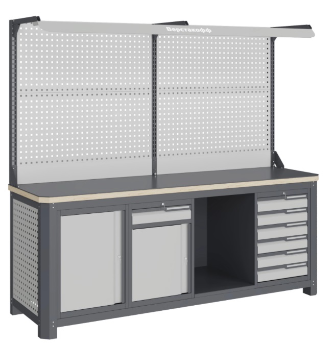 Состоит из столешницы шириной 1993 мм, рамы верстака, состоящей из опор, перемычек, боковых перфопанелей, малых модулей S6, S7, S8 и комплекта полка-стенка SW1, двойного экрана с кронштейнами и комплектом освещения.